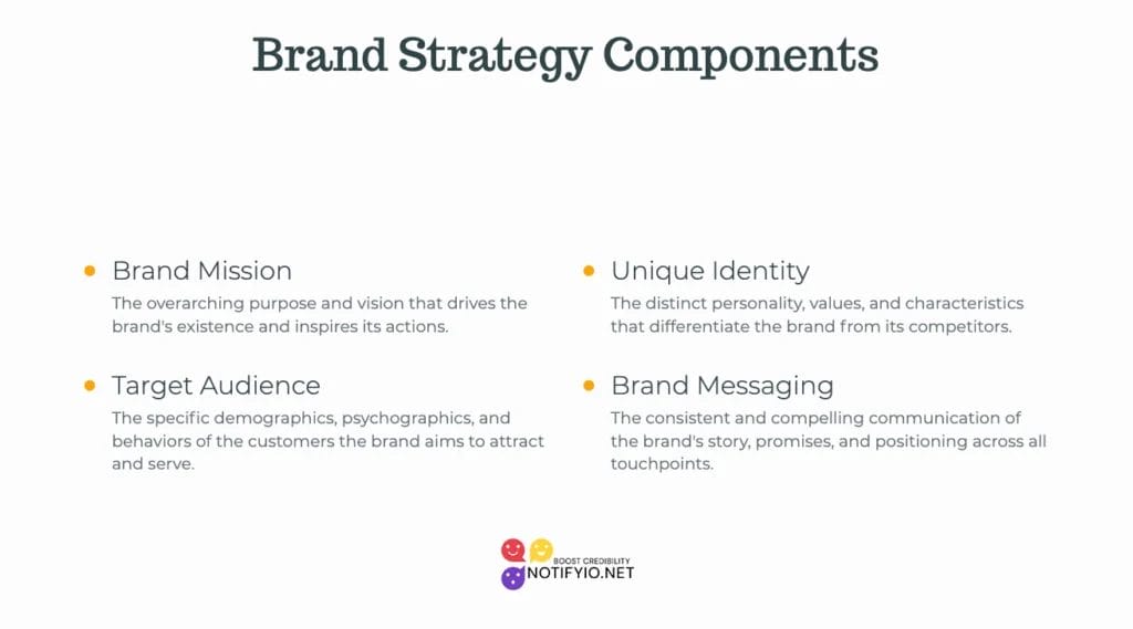 All these parts are the base for all brand decisions. They make sure everything about the brand is consistent, which is crucial for a successful brand. This leads to a powerful and recognizable brand.