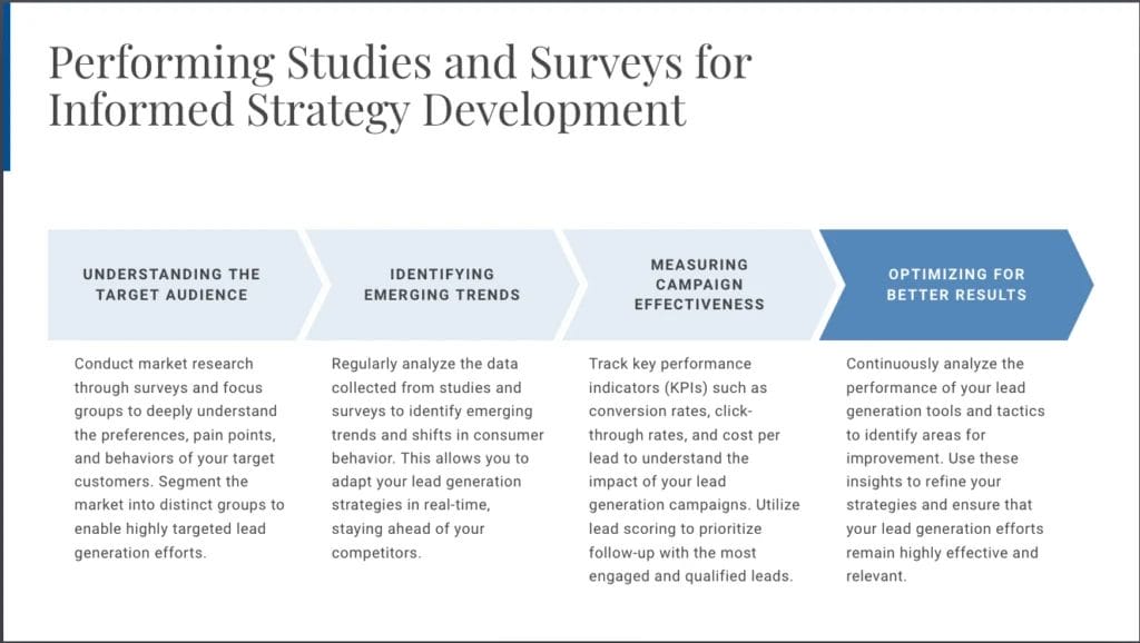 Furthermore, surveys and studies help in identifying emerging trends and shifts in consumer behavior. This information is instrumental in staying ahead of competitors by adapting strategies in real-time. Regularly conducting these researches ensures that the lead generation tactics remain relevant and highly targeted, significantly improving the chances of converting leads into customers.